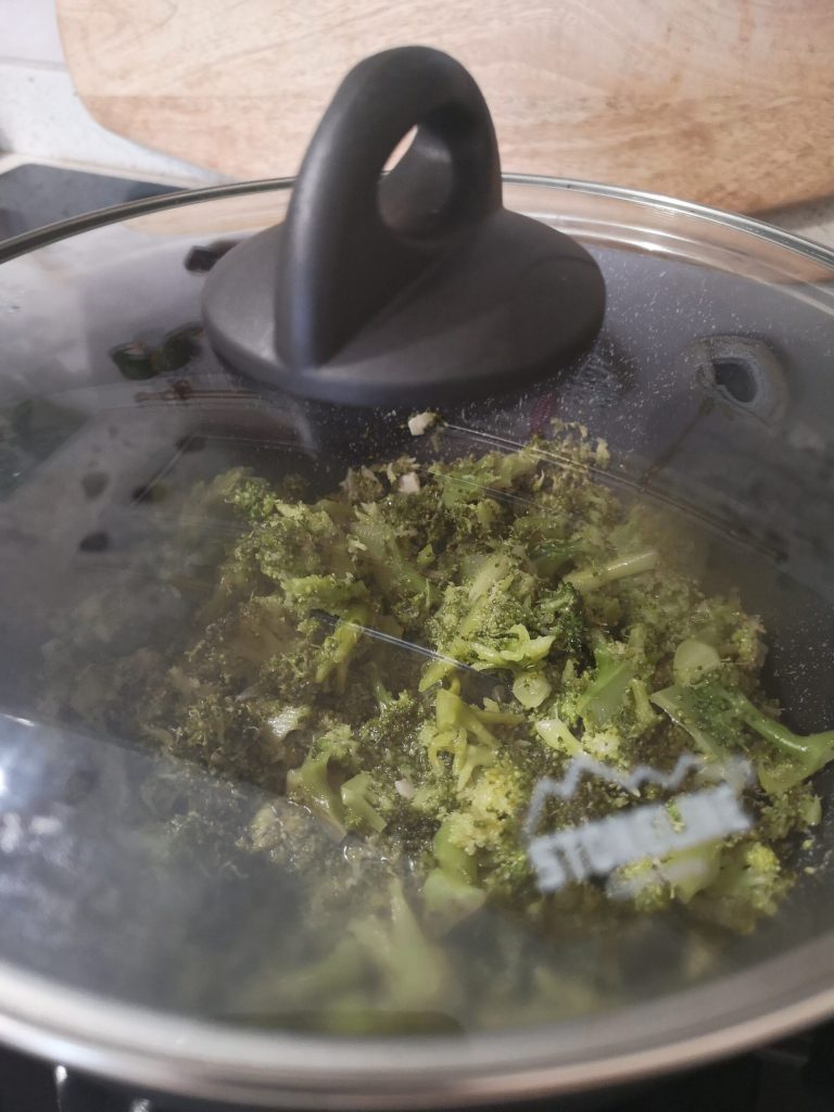 Añadir el brócoli y saltearlo a fuego vivo durante unos minutos, removiendo, sin dejar que se dore demasiado.