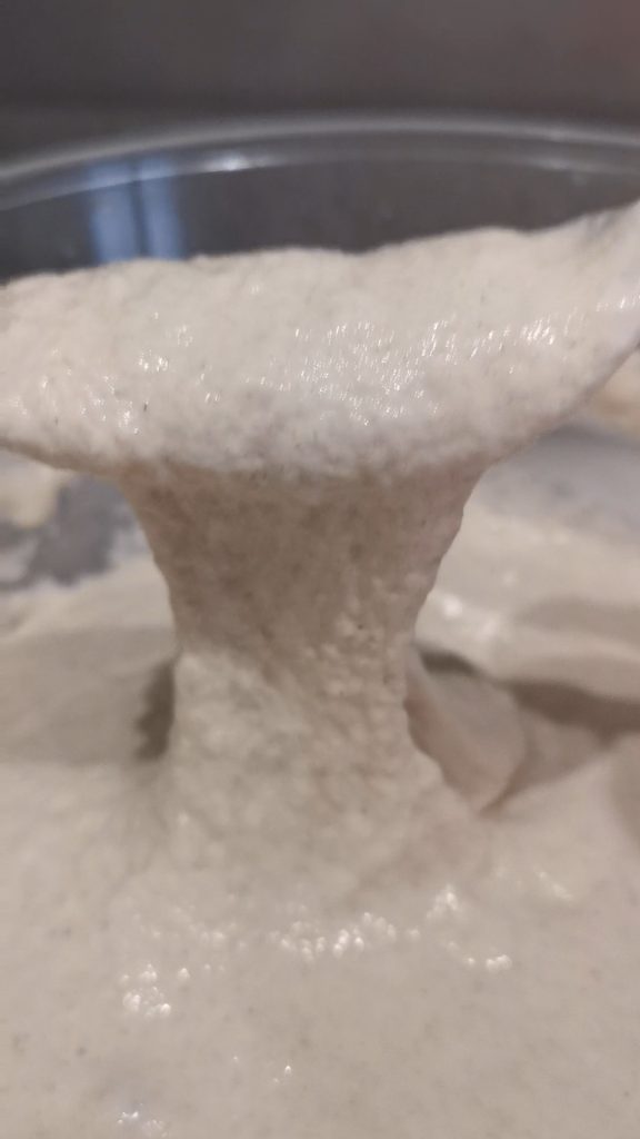 Te pongo aquí abajo una foto para mostrarte la consistencia de la masa. Debe ser pegajosa. Entonces, basándote en mi imagen, ajústate con la harina que estés utilizando, el resultado final, ya sea que hayas puesto 290g de harina o 270g, debe ser una masa blanda y pegajosa.