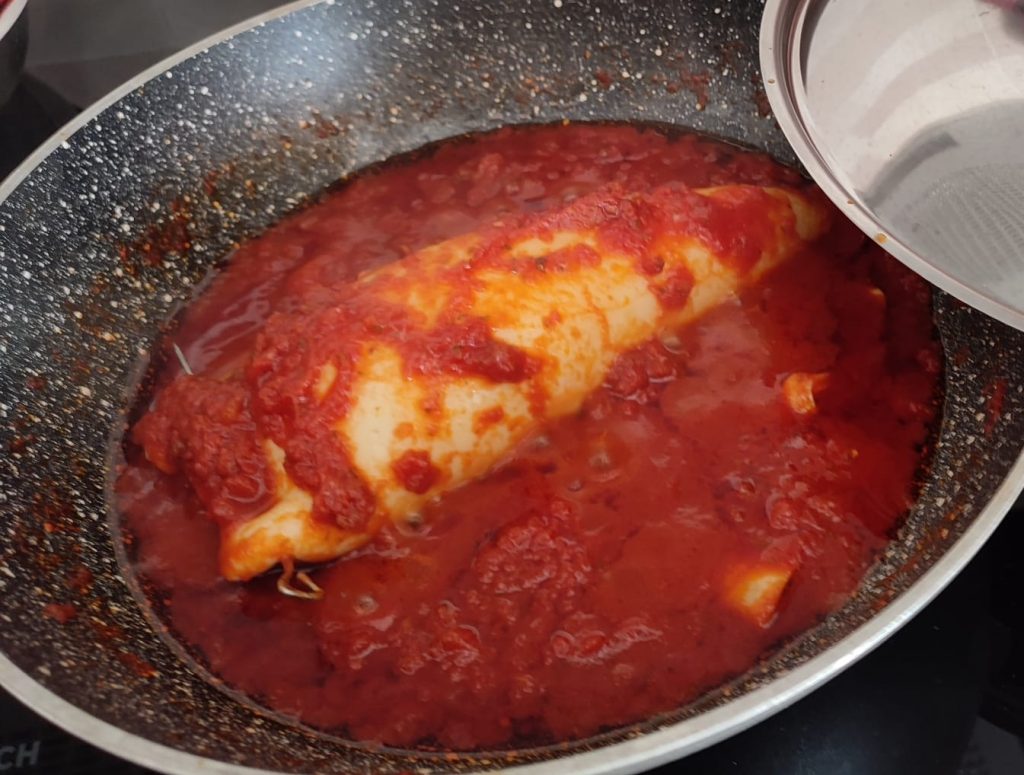 Dejé que se poche y añadí el perejil picado, la pulpa de tomate, la sal y el azúcar y lo dejé cocer durante unos diez minutos.