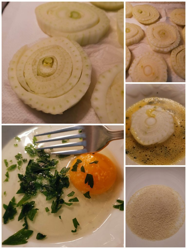 Toma las rodajas de hinojo y pásalas primero por el huevo batido y luego por el pan rallado.