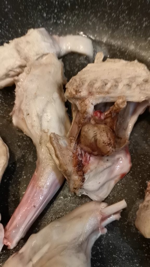 Tomamos el conejo y lo enjuagamos rápidamente y lo ponemos a remojar con agua y vinagre durante 10/15 minutos.