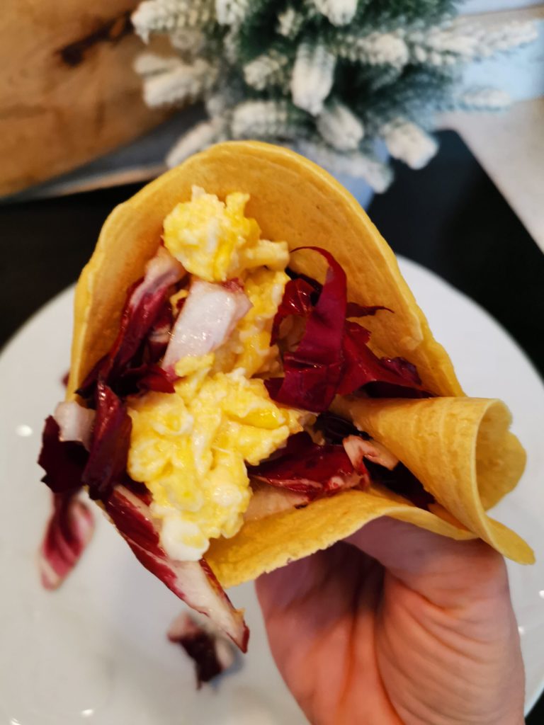 Yo he optado por prepararlas con base de radicchio rojo, huevos revueltos y algún hilito de mayonesa.