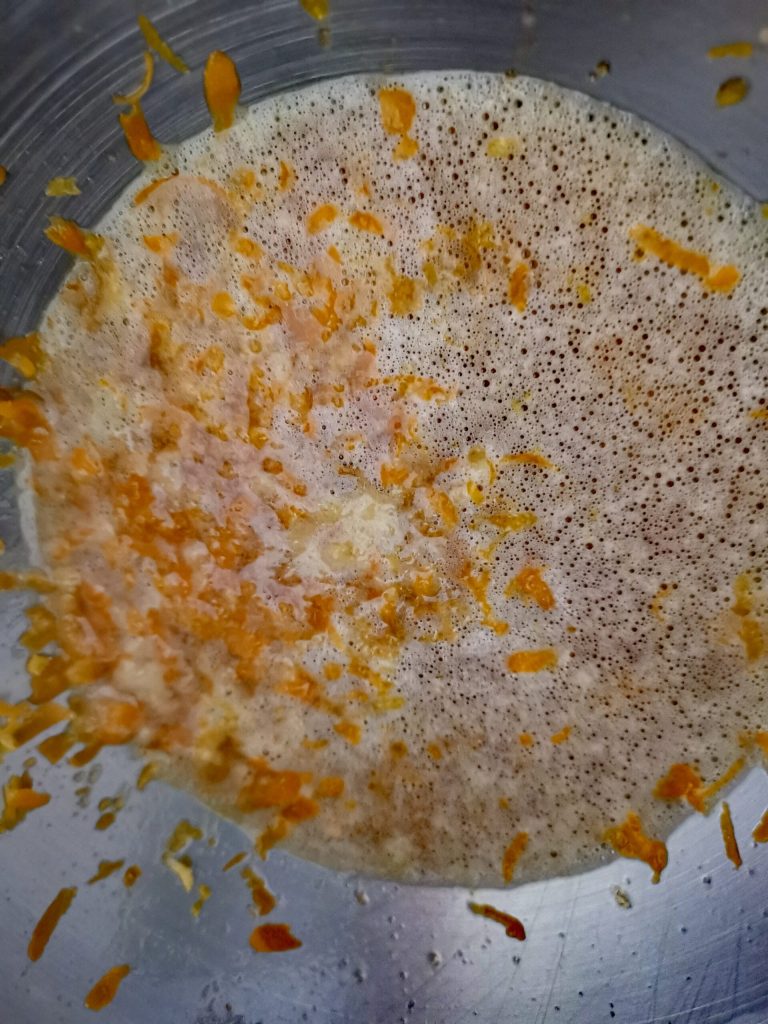 En el vaso de la amasadora mezcla juntos huevos y azúcar hasta obtener una mezcla espumosa. Añade una pizca de sal. Añadimos en hilo el aceite, la cáscara rallada de la naranja, el sobrecito de vainillina y continúa mezclando.Si no tienes amasadora puedes tranquilamente realizar los mismos pasos a mano.