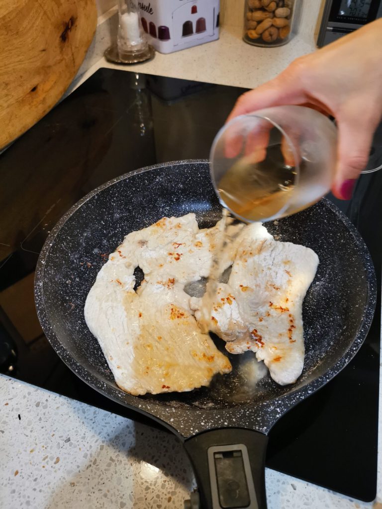 Ahora que el pavo está en la sartén lo doramos por ambos lados, cuando se haya formado una buena costra, estaremos listos para añadir el resto de los ingredientes.