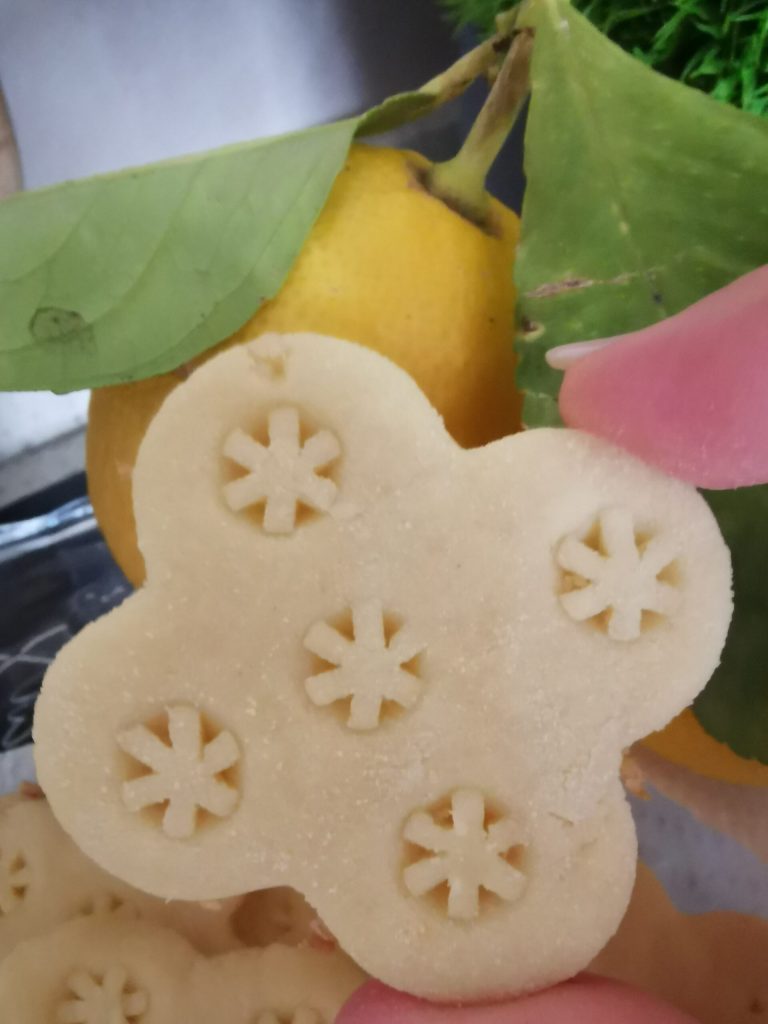 He cortado las galletas con una forma de flor y luego con la punta de una manga pastelera, pensé en recrear el adorno que veis.