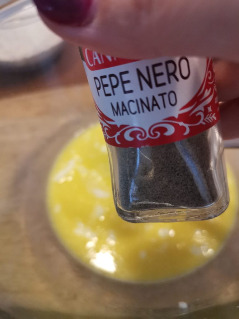 Después de la sal, mezclamos de nuevo y añadimos también una pizca de pimienta. La cantidad de sal y especias siempre es a nuestro gusto y costumbre.