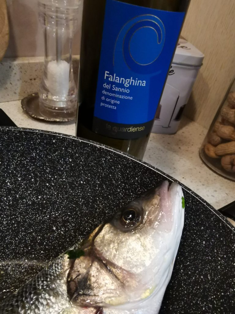 En este punto, pongo un poco más de perejil en la sartén, un chorrito de aceite sobre el pescado, sal y enciendo la placa de cocción. Ahora rocío con el vaso de vino blanco, dejo que se evapore y añado agua para cubrirlo. Nuestra lubina está lista para cocinarse. Después de unos 15/20 minutos, revísala. Verás que la carne empieza a volverse blanca y suave. Esto significa que está cocida. Como máximo, si tienes dudas, déjala 2/3 minutos más, no más. Obviamente, esto es para un pescado de 600g, si fuera más grande, debes cocinarlo más tiempo.