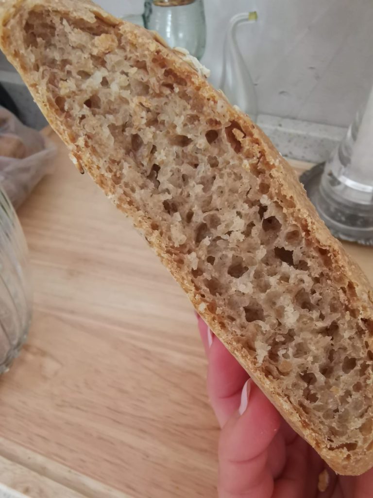 Una vez frío, el pan estará listo para disfrutar, crujiente por fuera y tierno por dentro.