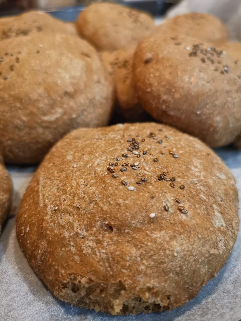 Deja reposar aún unas dos horas hasta que los panecillos dupliquen su tamaño. Si te gusta, pincela un poco la superficie del pan con aceite y añade semillas de chía.