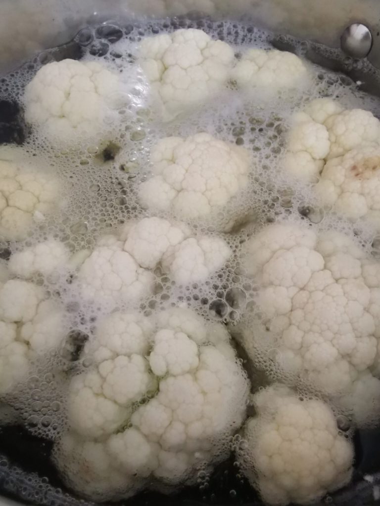 En una olla lleva a ebullición agua con sal y añade la coliflor, previamente lavada y cortada en floretes. Una vez cocida, en la misma agua cuece también las patatas cortadas en cubos.