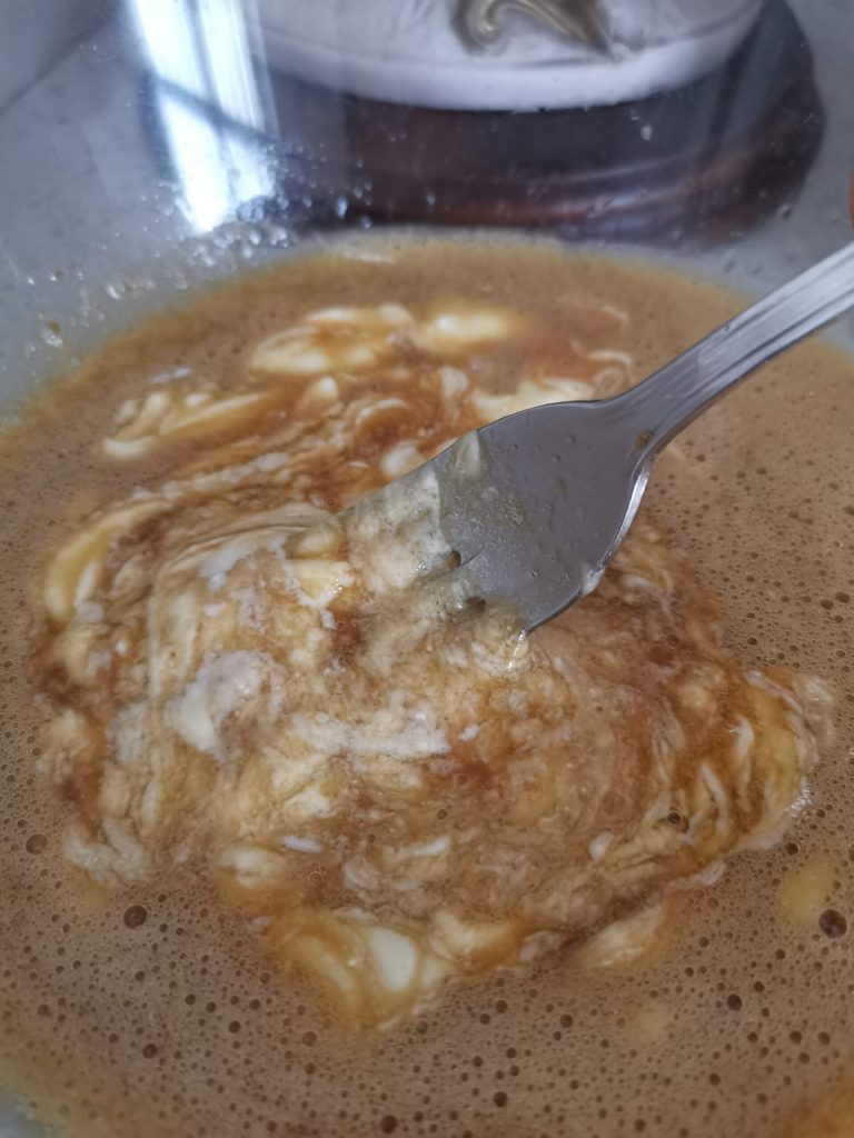 Con un tenedor o un batidor manual comenzamos a batir los huevos.