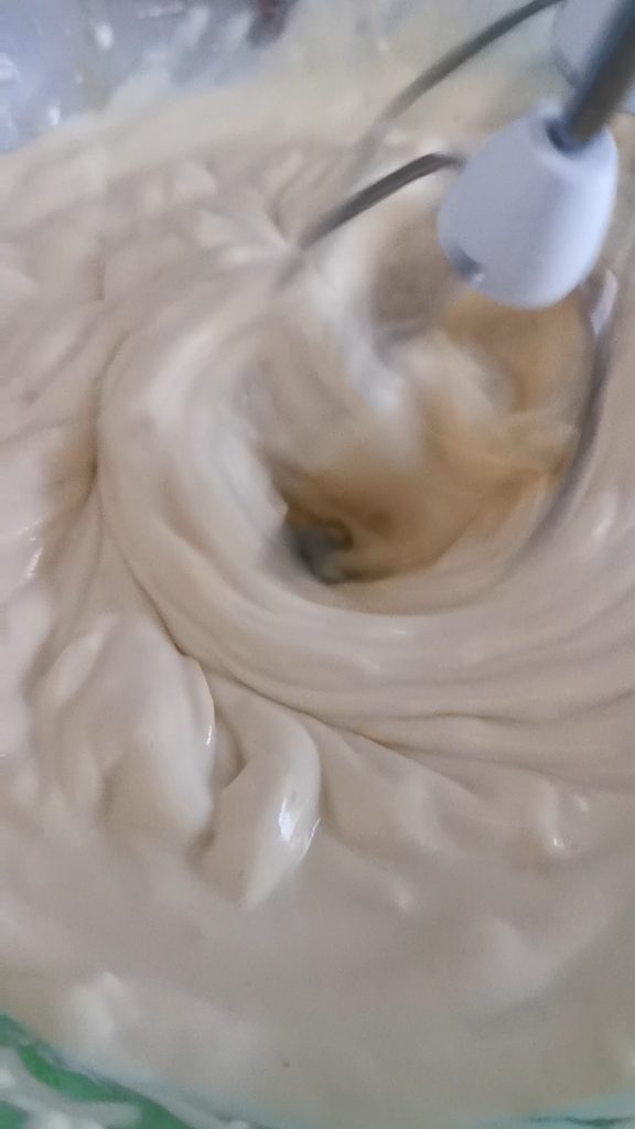Con las batidoras eléctricas empezamos a batir, yo aproximadamente 7 minutos a alta velocidad, para obtener una mezcla esponjosa y clara.