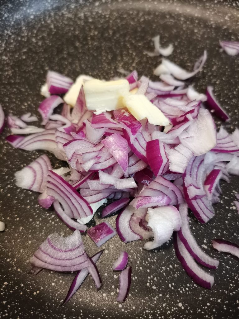 En una sartén, pochad la cebolla de Tropea con la mantequilla a fuego bajo. No debe quemarse ni pegarse al fondo, debe quedar espumosa.