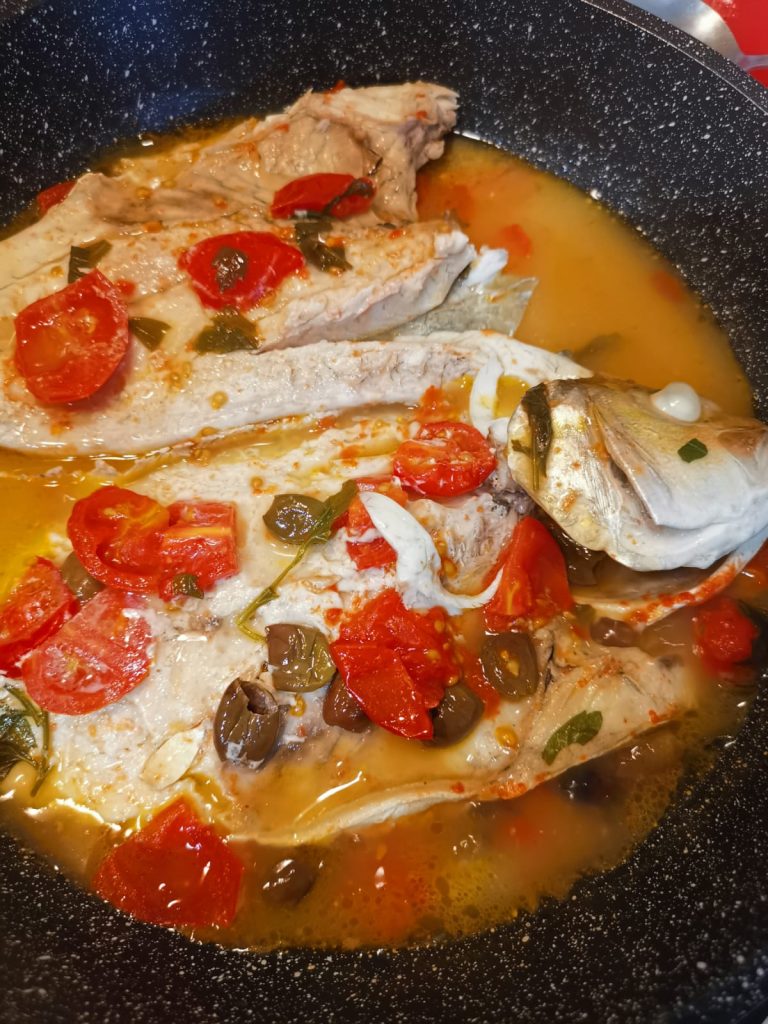 La seriola en sartén, tierna y delicada, combina a la perfección con la dulzura de los tomatitos y el sabor marcado de las alcaparras y las aceitunas, creando un plato equilibrado y realmente irresistible.