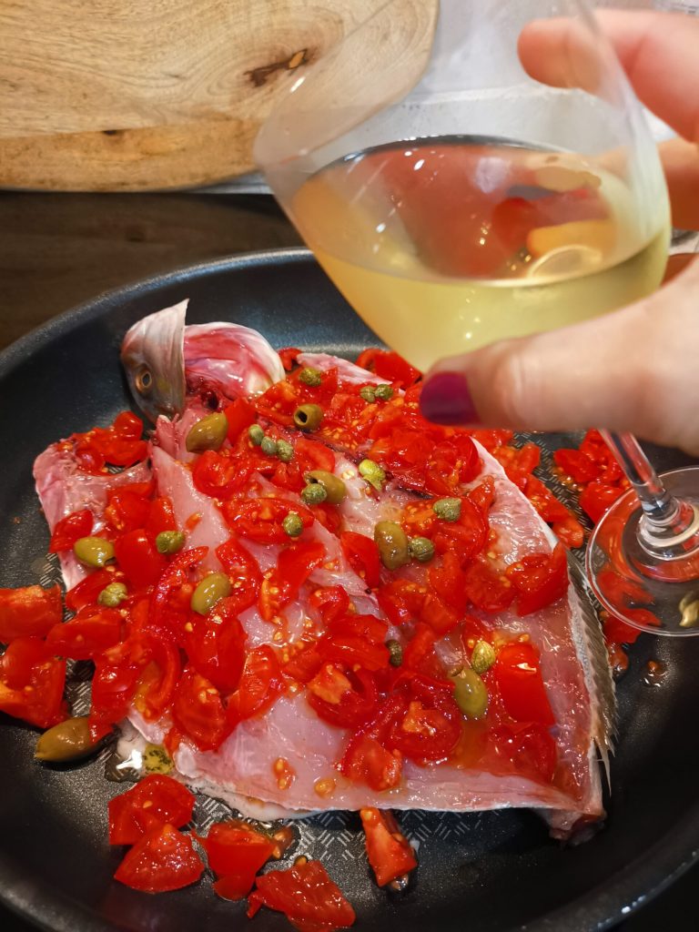 Laváis el pescado y lo colocáis en la sartén. Encended la cocina a fuego medio. Añadid por encima del pescadito los tomatitos, sal, aceite evo, alcaparras y aceitunas taggiasche.