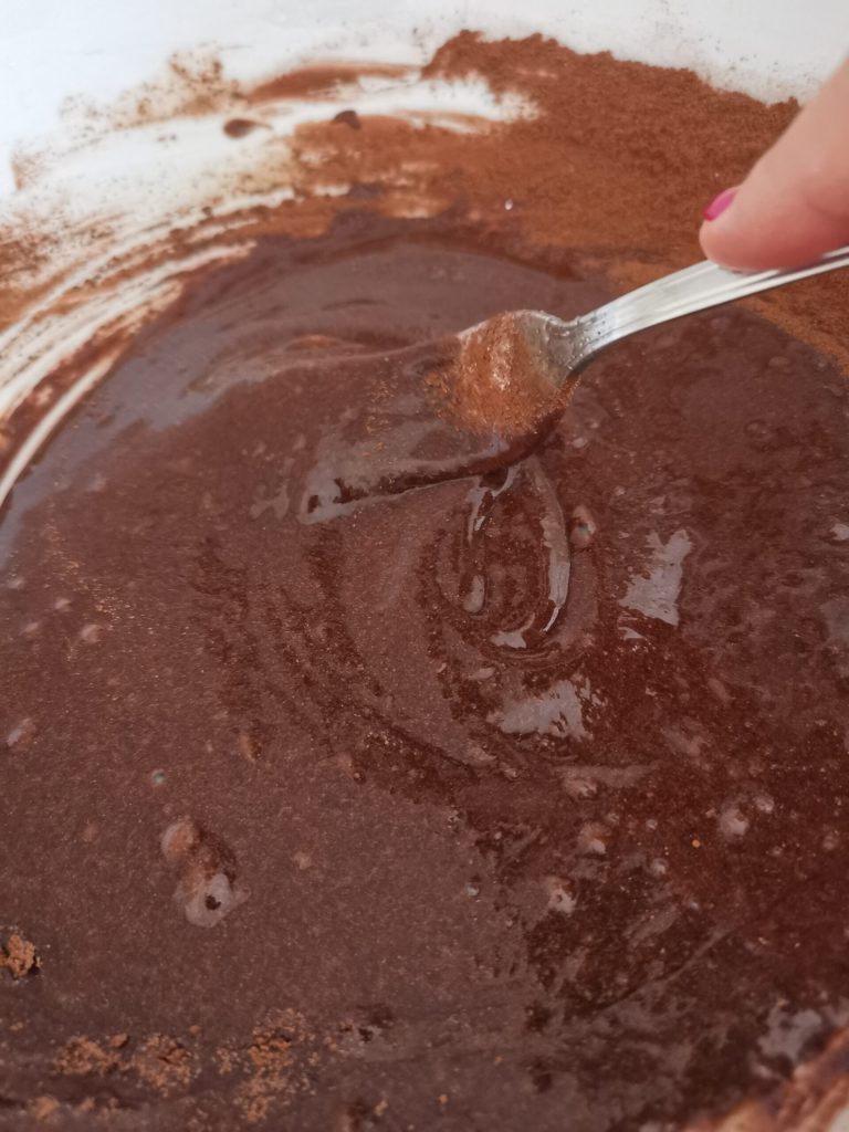 Ahora agregar el cacao amargo tamizado, la levadura y finalmente la harina, incorporándola poco a poco.