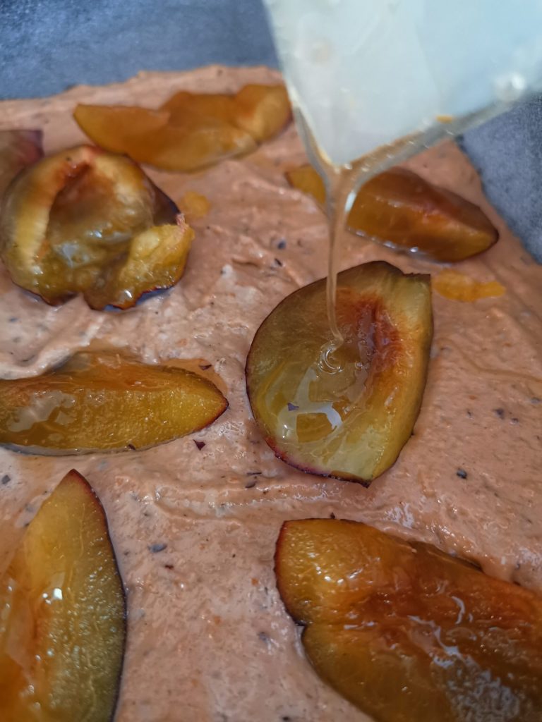 Vertida la mezcla en el molde, añadid en la superficie las ciruelas cortadas por la mitad.