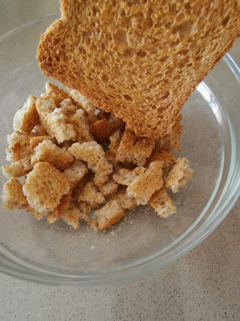 Tomamos las rebanadas de pan y las desmenuzamos.