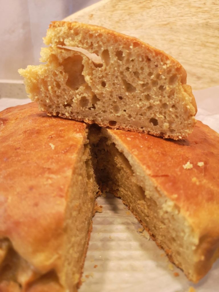 Es la clásica tarta para el desayuno o la merienda que se prepara en pocos minutos, pero con una textura que casi recuerda a una pastelería, gracias a su alveolado esponjoso y bien desarrollado.