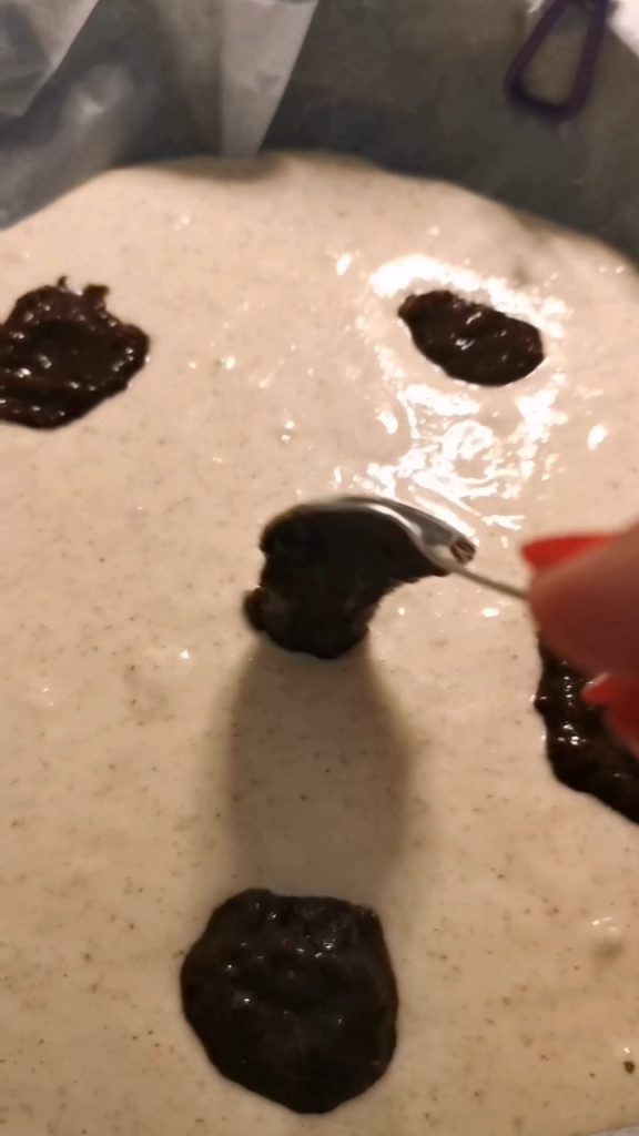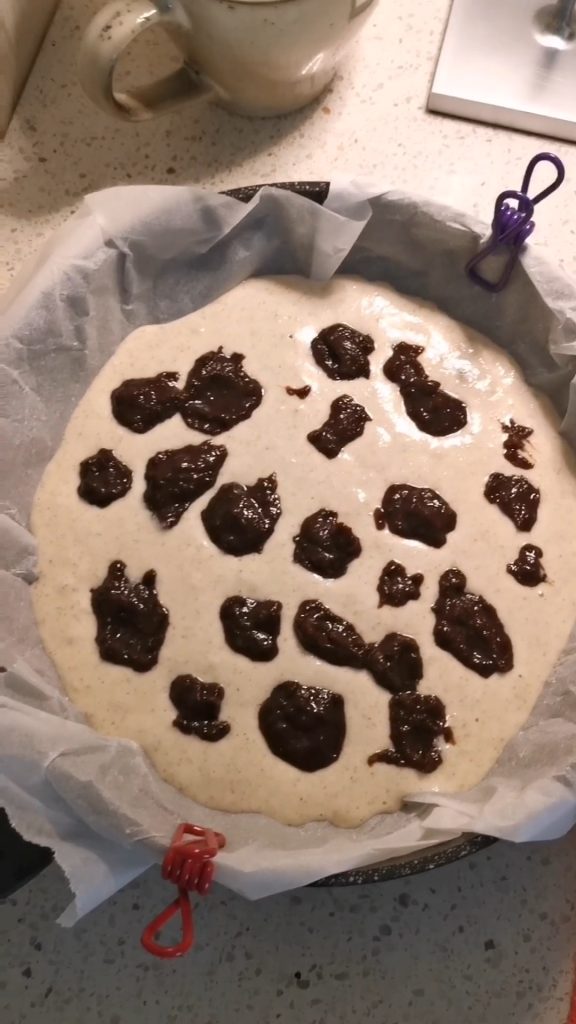 • Antes de poner la tarta a cocinar en el fogón, vamos a decorar la tarta con cucharaditas de mermelada. Yo elegí una mermelada de ciruelas sin azúcares añadidos. Escoged la que más os guste y prefiráis