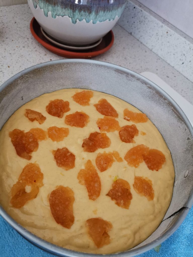 Una vez vertida la masa en el molde voy a añadir encima muchos pequeños trocitos de mermelada de limón. Horneamos a 170 grados, horno precalentado estático, durante unos 35 minutos. Ajusten según su horno y hagan siempre la prueba del palillo antes de sacar el dulce.