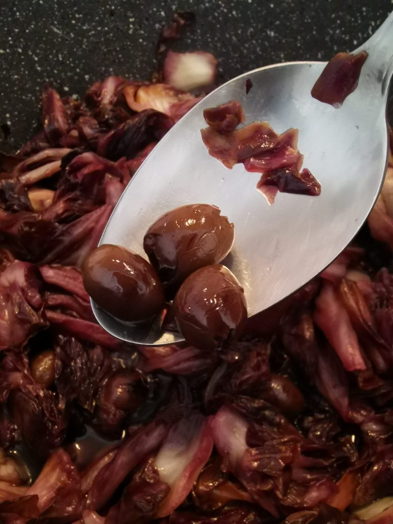 La extendemos en el molde, pinchamos un poco el fondo y colocamos encima el relleno con el radicchio, preparado previamente.