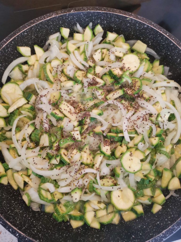 • Primero lava y recorta los extremos de los calabacines, luego córtalos en rodajas. Corta también la cebolla en láminas finas.