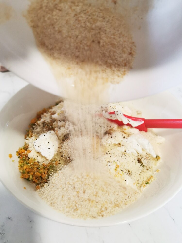 • Vertemos la mezcla dentro de un cuenco y agregamos el parmigiano con la ricota, el huevo, el pan rallado, sal, ajo en polvo y pimienta a gusto.