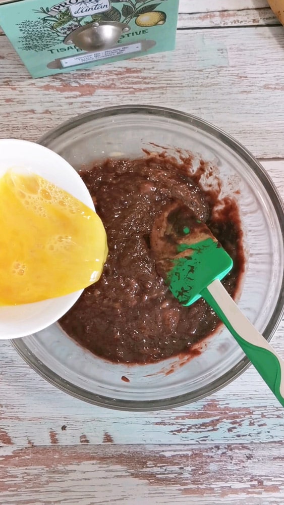 En un bol grande, aplastamos 2 plátanos maduros, luego añadimos el cacao y mezclamos bien. También añadimos la mantequilla de cacahuete.