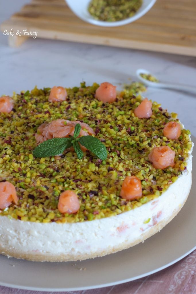 La cheesecake es la típica tarta americana a base de queso fresco, generalmente estamos acostumbrados a prepararla dulce, pero puedo aseguraros que también en versión salada está riquísima. La cheesecake salada al salmón es un plato frío perfecto para el verano y no solo! De hecho, también es perfecta como entrante, tan deliciosa y delicada que gusta a grandes y pequeños. Ideal para poner en la mesa en las fiestas navideñas y, si tenéis invitados, el éxito está asegurado. Se prepara con gran facilidad y es rápida de hacer, decorada con granillo de pistacho, seguro será un plato que sorprenderá a todos.