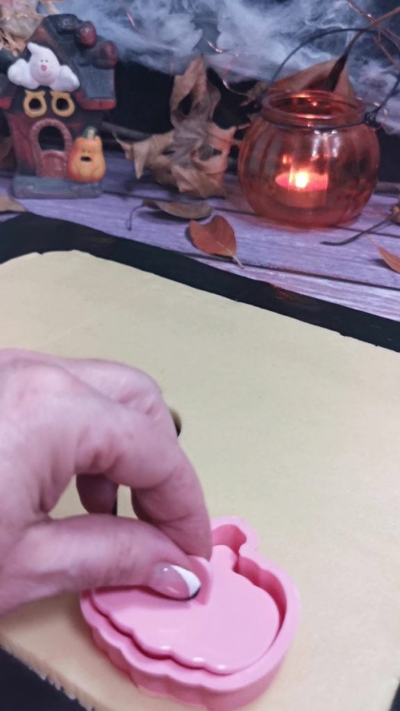 Después del tiempo de reposo, sacamos la masa de la nevera y cortamos las galletas de Halloween, yo he creado muchas calabazas divertidas, pero se puede variar con otros moldes.