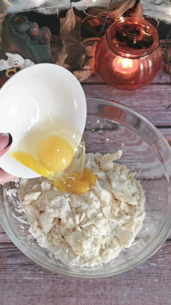 Para preparar la receta de las galletas de Halloween fáciles, ponemos en un bol grande la harina, añadimos la mantequilla fría de la nevera en pequeños trozos y empezamos a amasar con las manos.