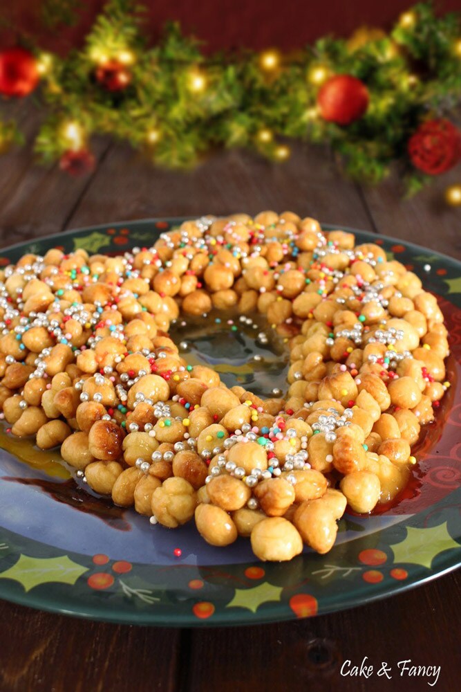 Muchas bolas golosas que se fríen, para luego ser rellenadas con miel y cubiertas con pequeños confites de colores y si se desea, frutas confitadas. Para hacerlos se necesita algo de tiempo, pero son fáciles de hacer y si se desea, se pueden preparar con antelación; de hecho, se mantienen perfectos durante varios días, pero el glaseado con miel debe hacerse al momento. Esta receta es la que preparaba mi abuela, ella no añadía azúcar en la masa. Una receta realmente antigua y simple que en la familia seguimos haciendo. Si nunca has preparado este delicioso dulce, te recomiendo de verdad probarlo.