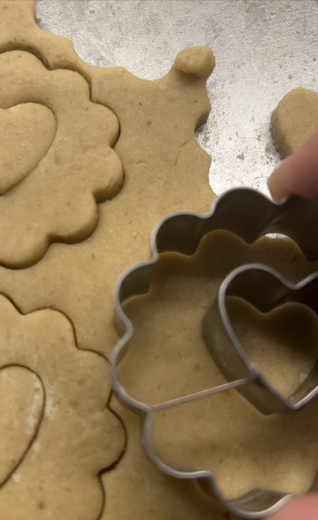 Cortamos las formas de las galletas y las colocamos en el tapete microperforado o en el papel para horno en la bandeja previamente preparada.