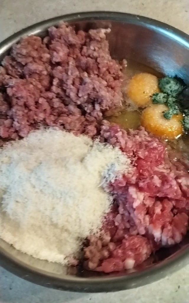Mientras tanto, coloca en un bol los huevos, la carne molida, la salchicha desmenuzada, el parmesano, el ajo, el perejil, la sal y mezcla bien para obtener una mezcla suave, pero no demasiado blanda.