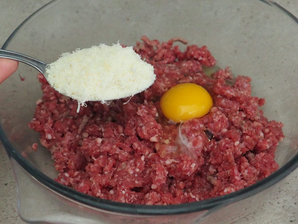 En un tazón ponga la carne molida, agregue el huevo, las dos cucharadas de parmesano.
