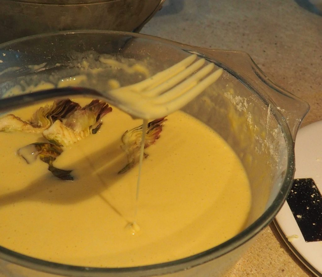 Prepara la tempura batiendo los huevos con la leche, añade la harina, el agua, la sal. La tempura no debe ser demasiado líquida, debe adherirse a las alcachofas. Pon las alcachofas en la tempura y cúbrelas bien.