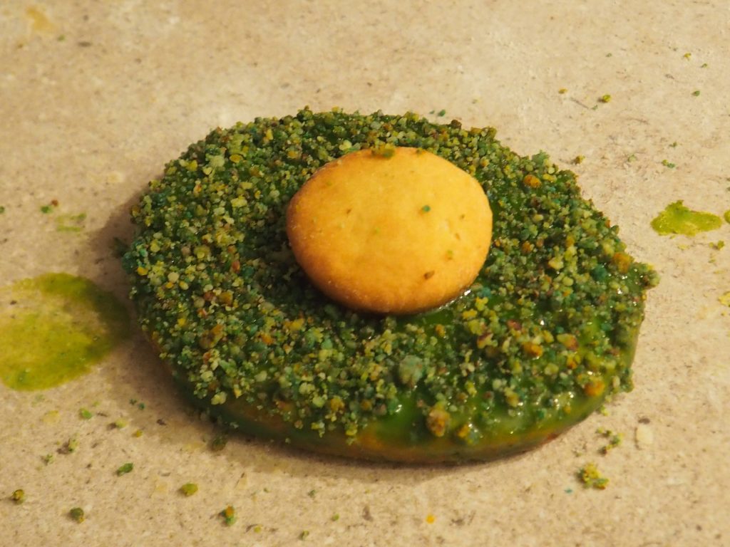 Con un pincel de cocina cubre con la glasa verde la galleta de 10 cm de diámetro, asegurándote de cubrir también los bordes. En la parte central pon un poco más de glasa.