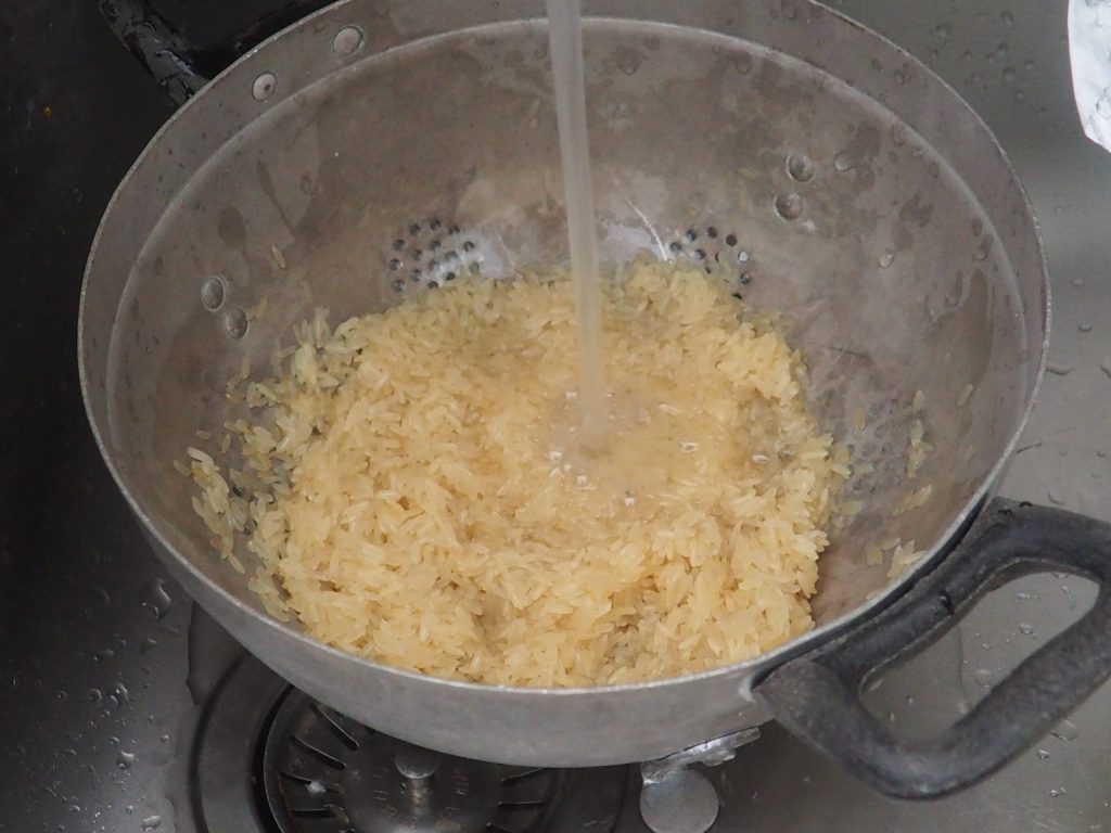 Mientras tanto, laven el arroz pasándolo bajo el chorro de agua en un colador.