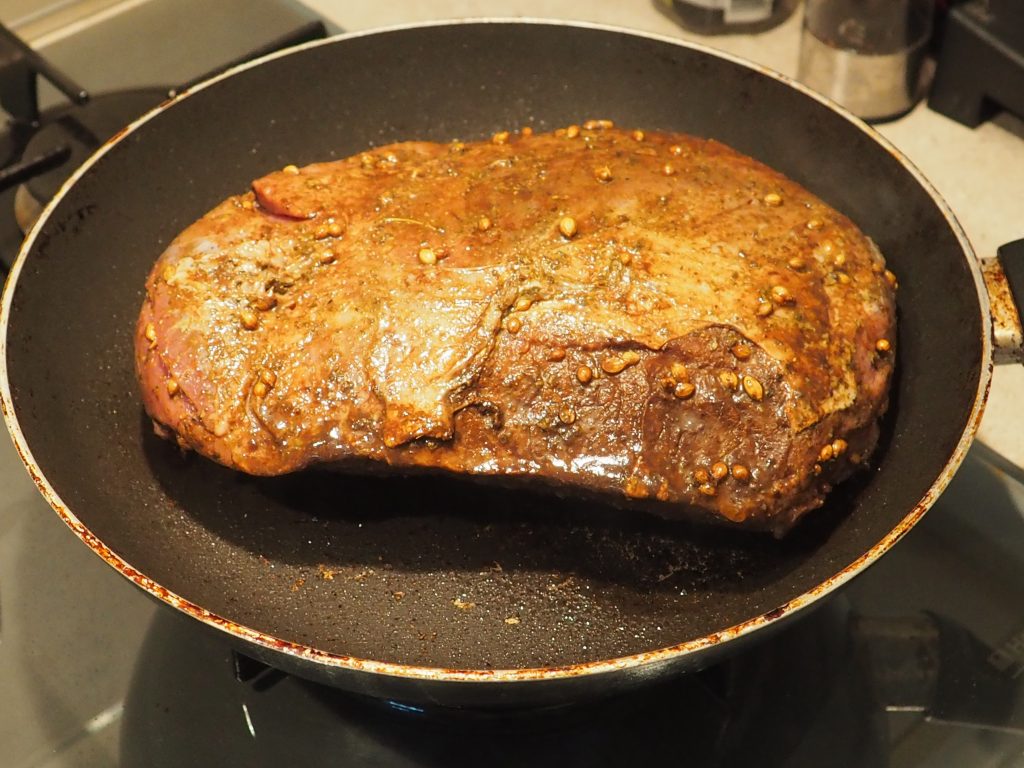 Ahora sácala del recipiente, calienta bien una sartén y dora la carne por al menos 3 minutos de cada lado, para sellarla.