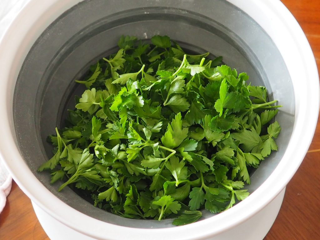 • Lavad el perejil, secadlo bien, tomad solo las hojas y picadlas con una media luna.
