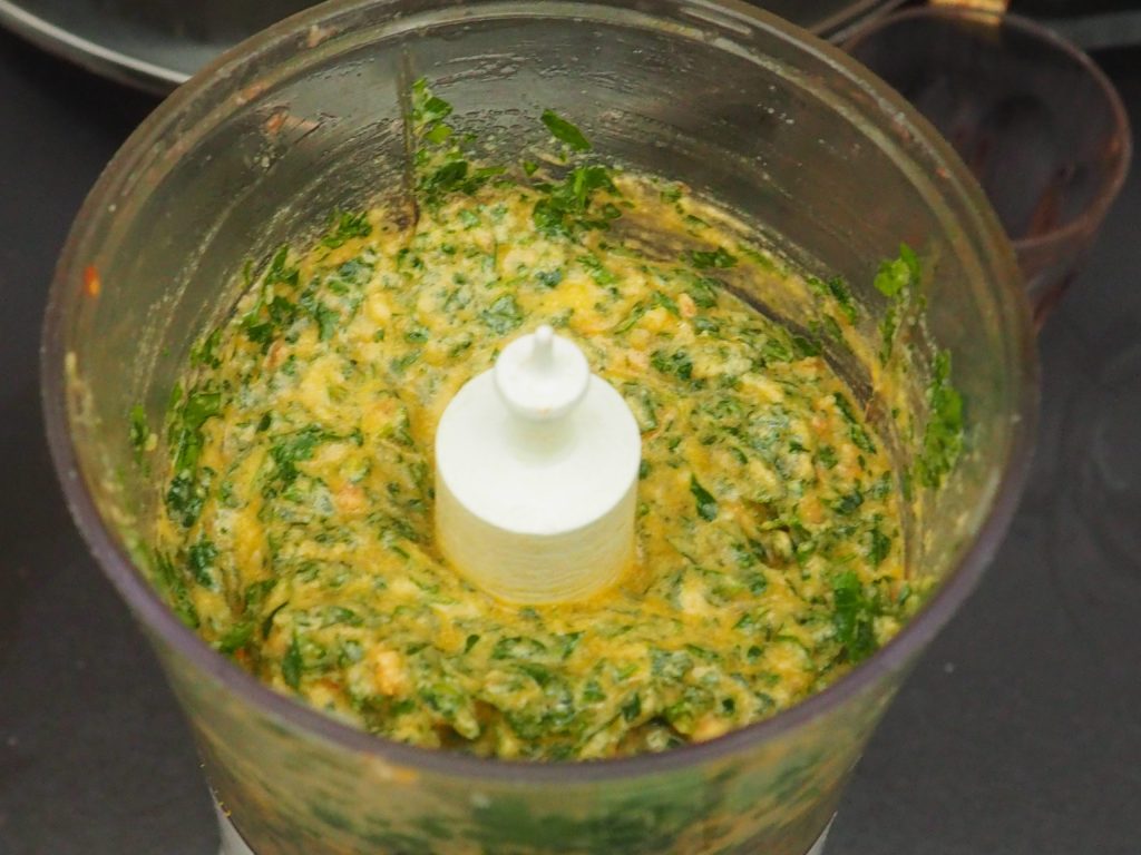 • Pon en un mezclador el perejil picado, añade el tomate, el pimiento, el pan remojado en vinagre, las yemas de los huevos duros, la sal, el ajo, el aceite y tritura hasta obtener una mezcla homogénea.