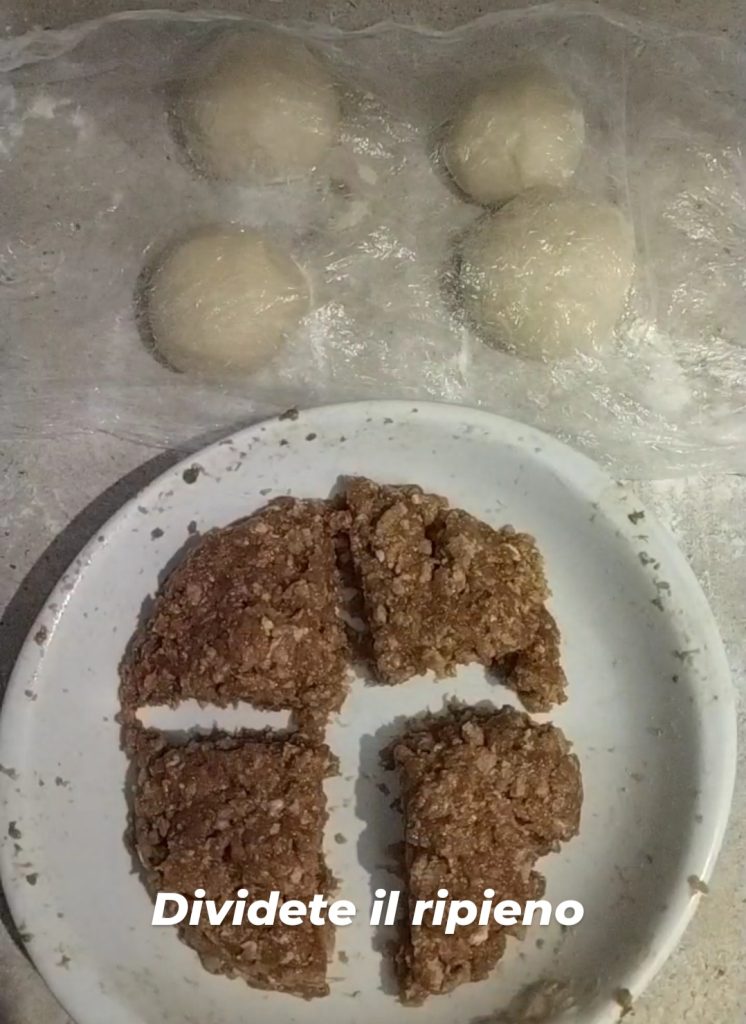 • Divídela en cuatro bolas iguales, divide también el relleno en cuatro partes.