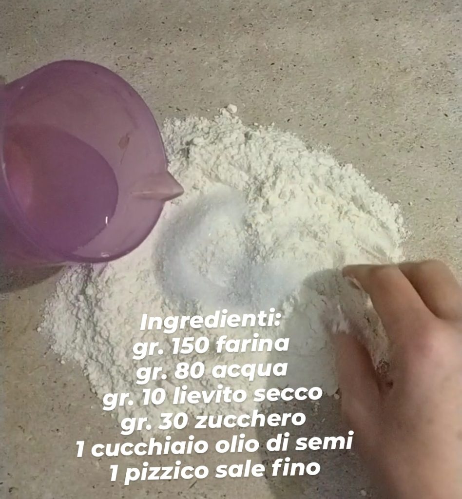 • En una superficie de trabajo, mezcla la harina, el agua, la levadura, el azúcar, el aceite y la sal.