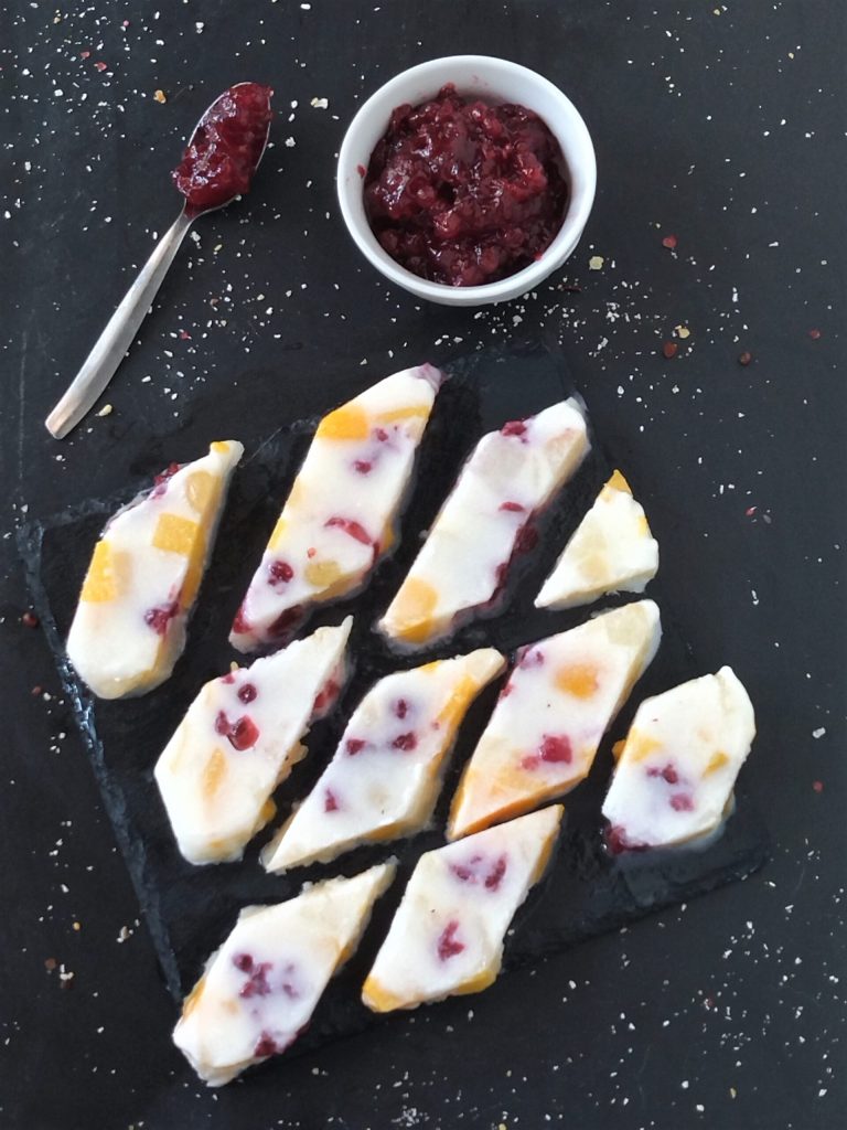 Además, en lugar de la mermelada de arándanos rojos puedes añadir la que prefieras. Yo opté por esta porque aporta una nota de acidez a la macedonia de fruta que suele ser bastante dulce.