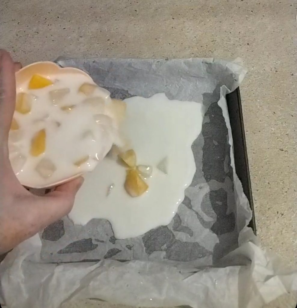 Añade al yogur tanto la fruta en almíbar como el almíbar presente en el recipiente. Mezcla bien. Forra un molde cuadrado de 20 cm por lado con un papel de horno que habrás mojado y escurrido ligeramente. Vierte la mezcla dentro del molde.