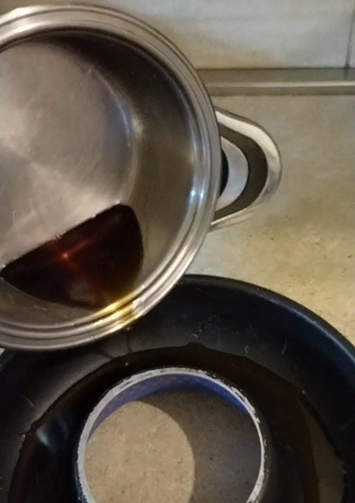 Engrasa y enharina los bordes. Engrasa y enharina el interior de un molde de bizcocho de 25 cm de diámetro. Vierte inmediatamente el caramelo dentro, para evitar que se endurezca.