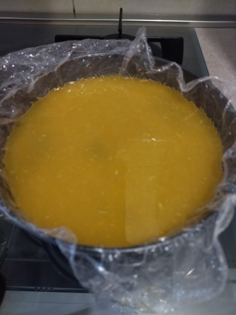 Ahora añade este jugo al restante, mezcla y vierte todo en un molde de 22 cm de diámetro previamente cubierto con film transparente. Deja enfriar por tres o cuatro horas en la nevera, mejor si es durante toda la noche. Yo no añadí azúcar, pero si te gusta más dulce puedes ponerlo.