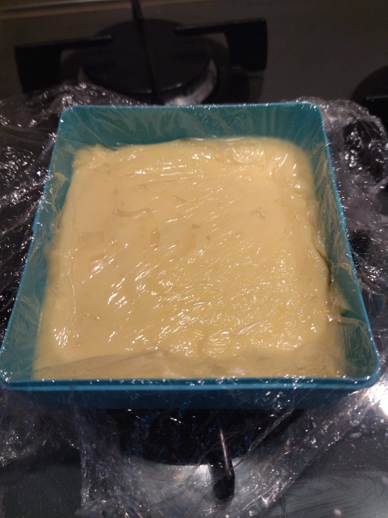 En este punto pon la crema en un recipiente, cúbrela con film transparente para evitar que se forme una costra dura en la superficie, deja enfriar por unas horas. Si es posible déjala en la nevera para que se endurezca durante toda la noche.