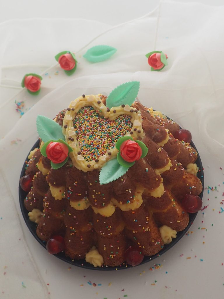 Ahora procede con la decoración. Unta un poco de remojo en la superficie y en los bordes, en la parte más expuesta. Coloca un cortador con forma de corazón en la superficie y rellénalo con bolitas de azúcar de colores. Retira el cortador y siempre con la jeringa y la crema de limón, marca el contorno.